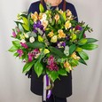 Букет нежных маттиол, тюльпанов и роз