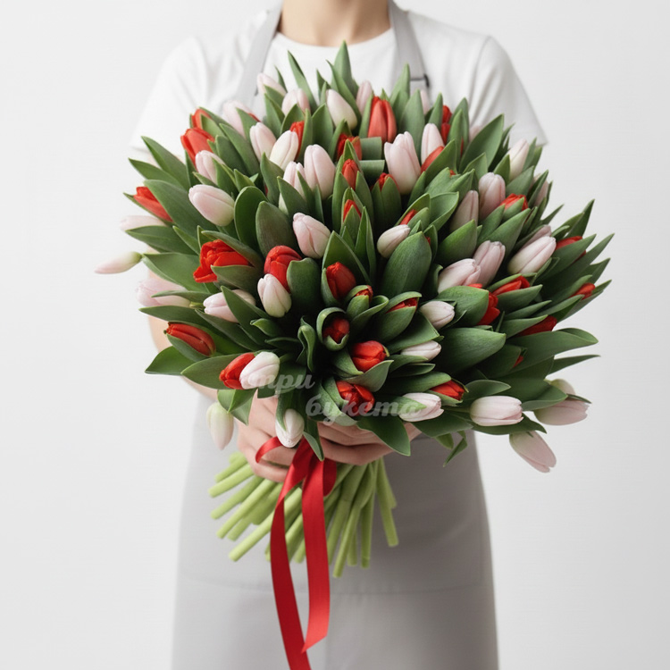 - Красные и белые тюльпаны, 101 шт.