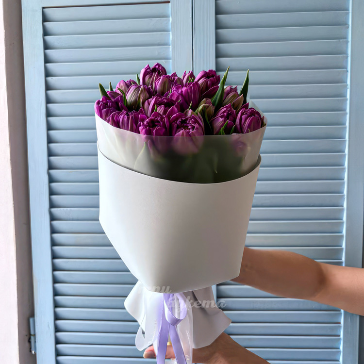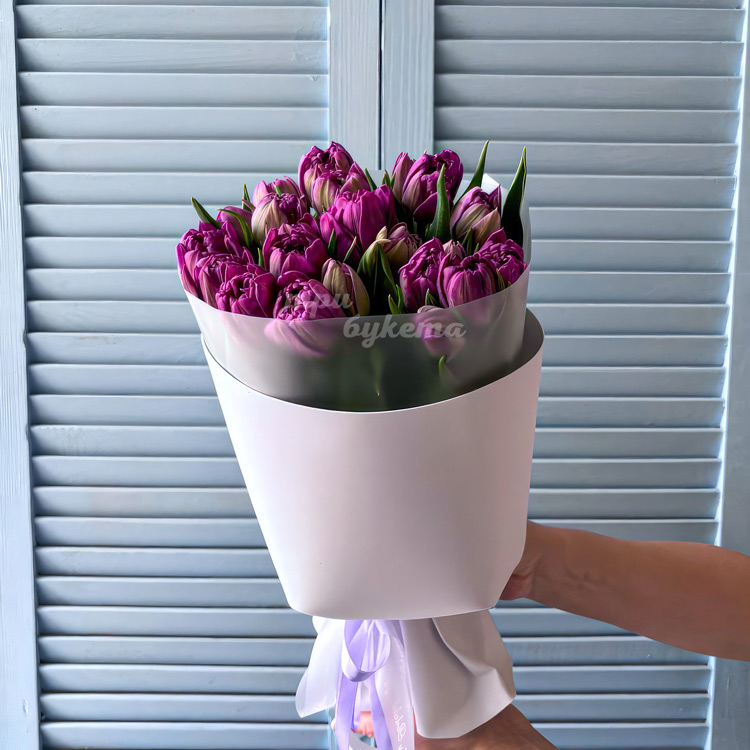 Букет 15 пионовидных сиреневых тюльпанов