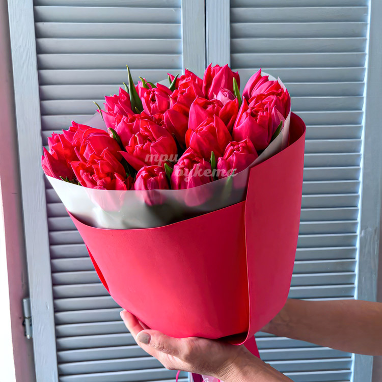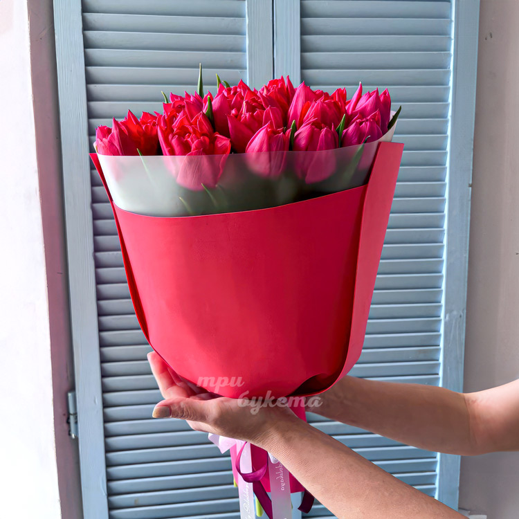 Букет 25 пионовидных тюльпанов цвета Фуксия