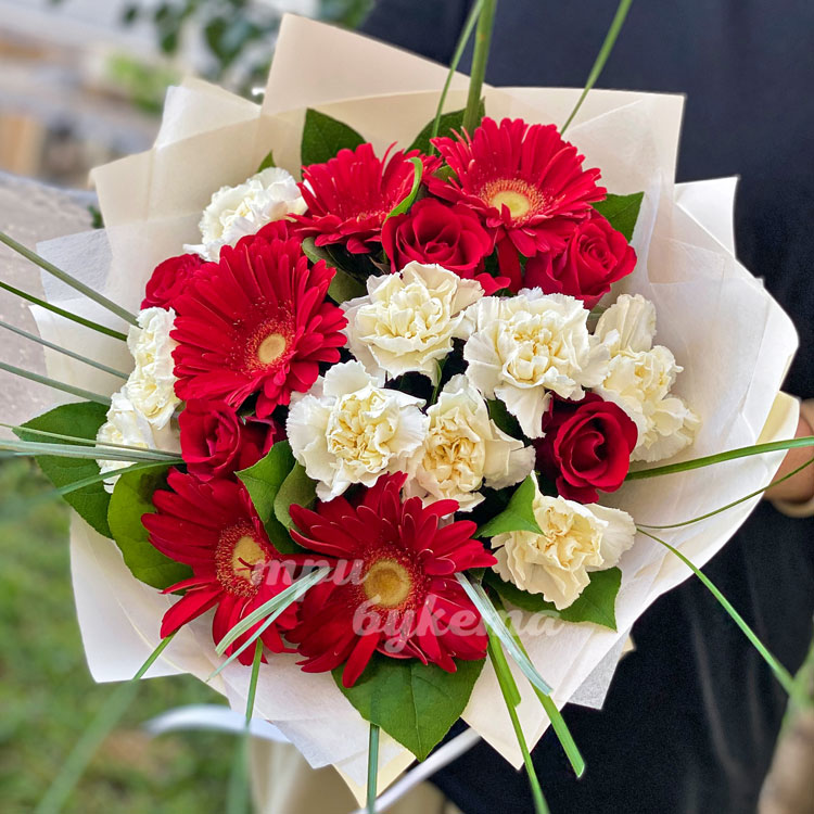 Букет белых гвоздик и красных гербер