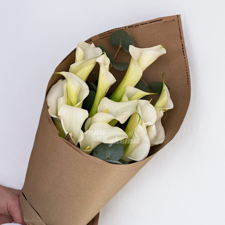 Букет белых калл с эвкалиптом в крафте