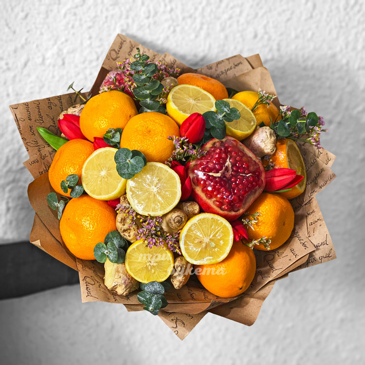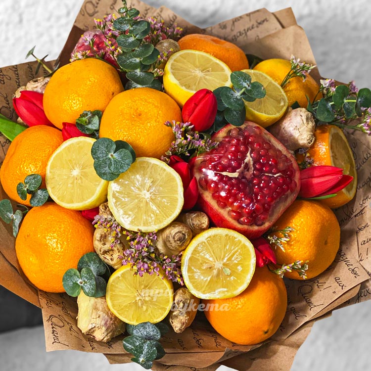 Букет цитрусовых с имбирем и тюльпанами