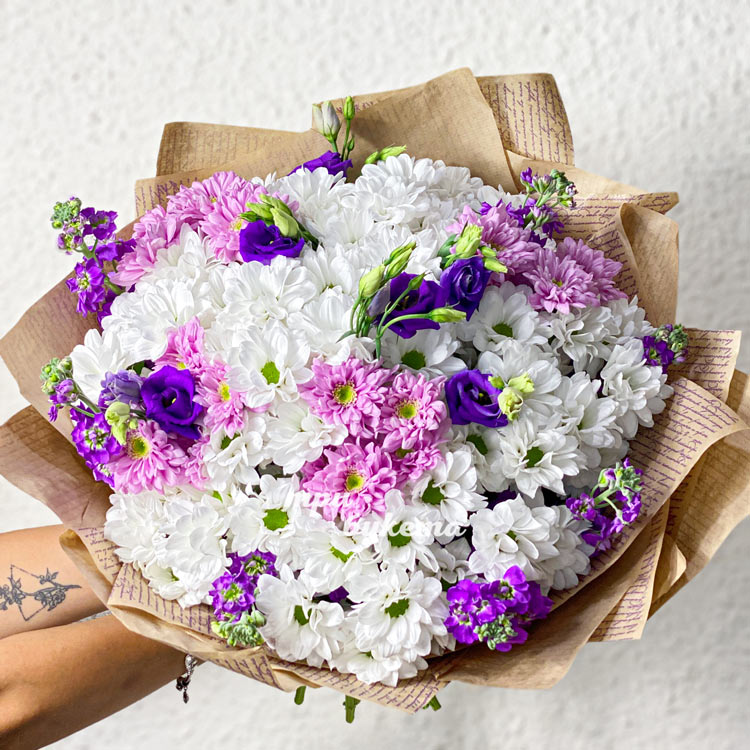 Букет хризантем с маттиолами в крафте