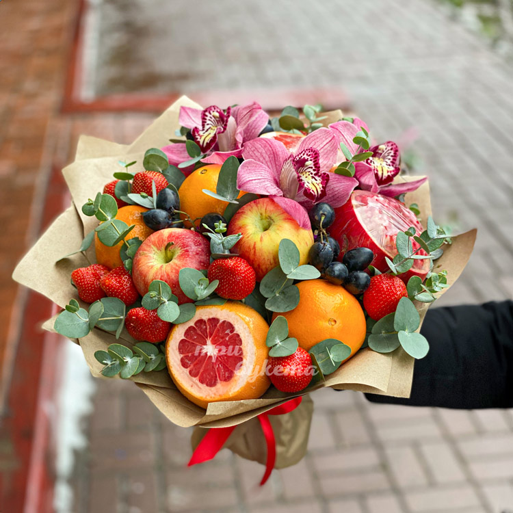 Букет из фруктов и клубники с орхидеями