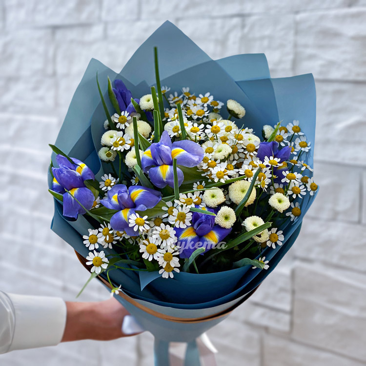 Букет из ирисов, ромашек и хризантем
