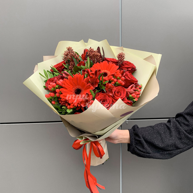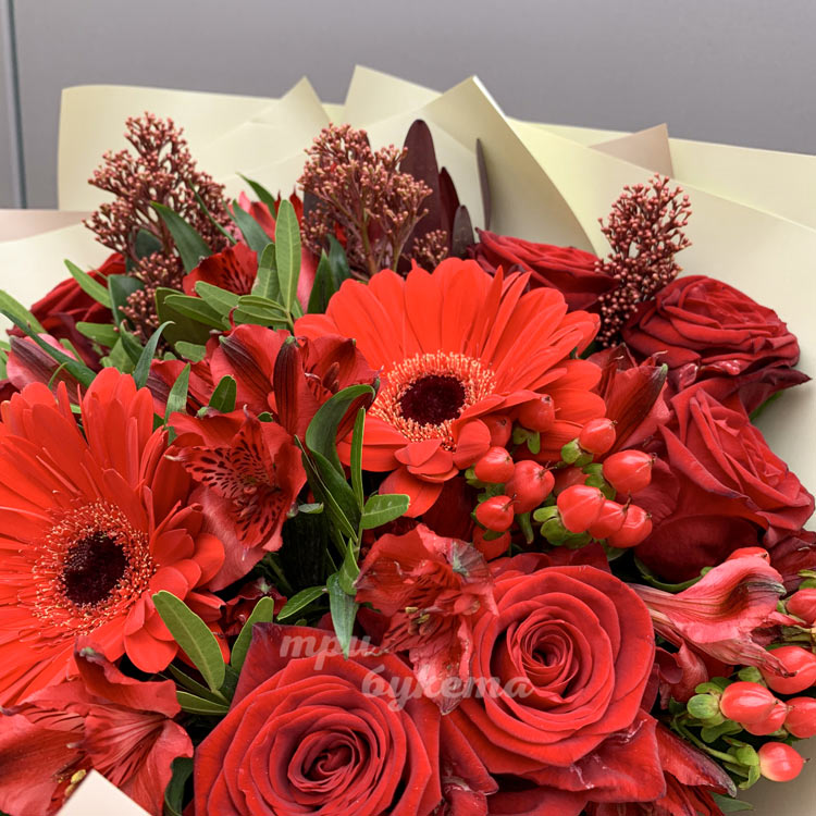 Букет из красных гербер, роз и скимии