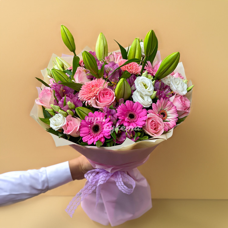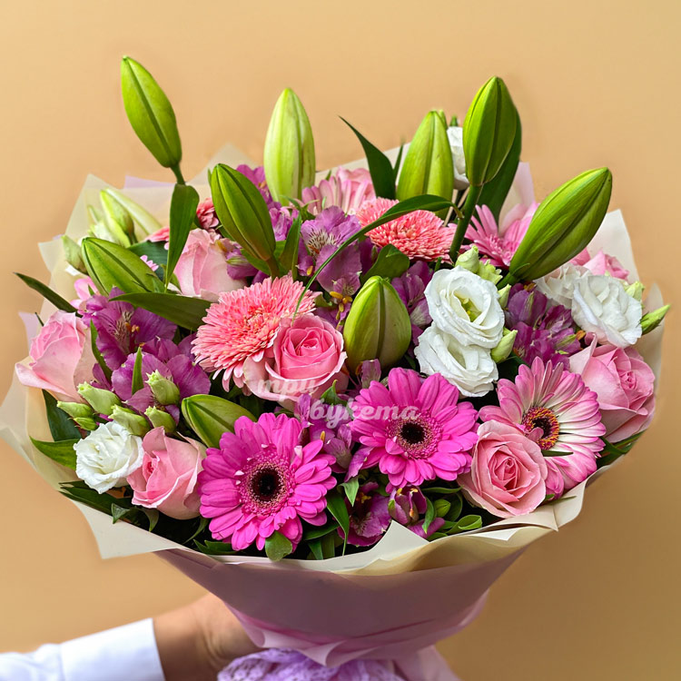 Букет из розовых гербер, роз и лилий