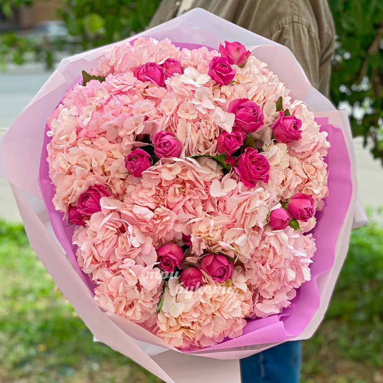 Букет коралловых гортензий и розовых роз