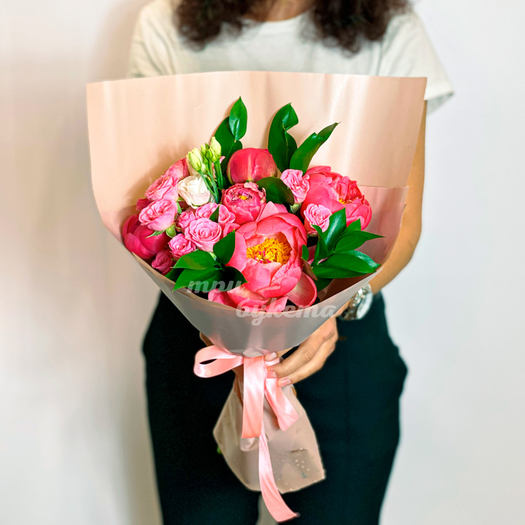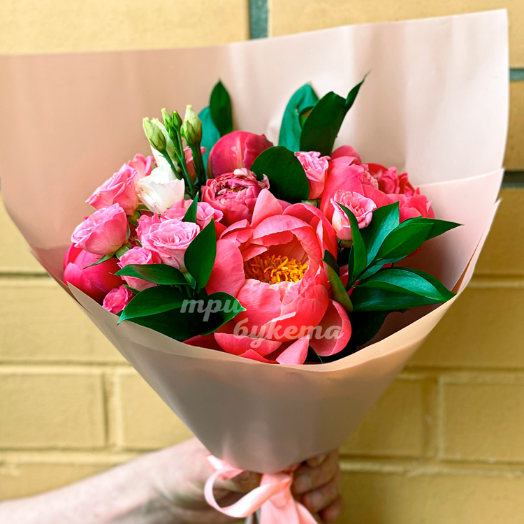 Букет коралловых пионов и куст. роз