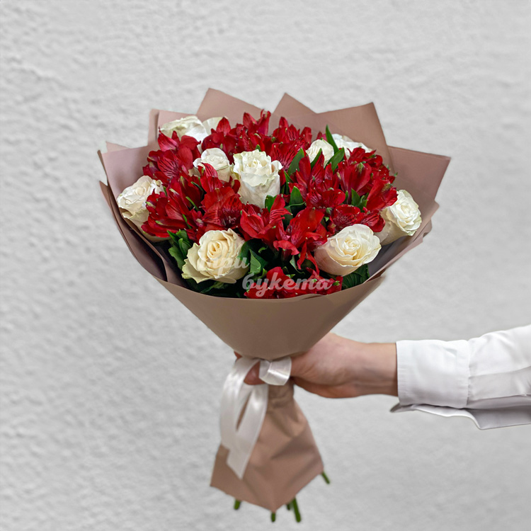 Букет красных альстромерий и белых роз