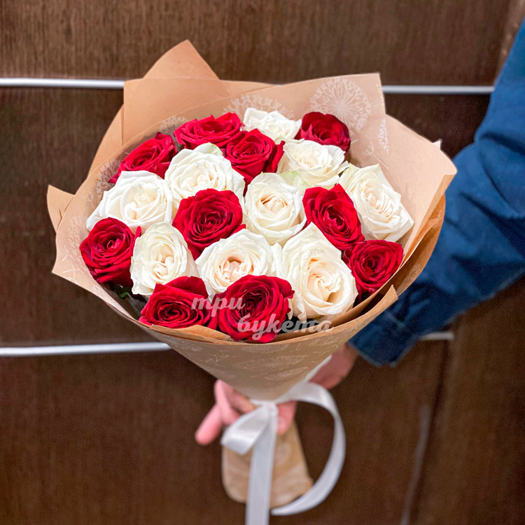 Букет красных и белых роз в крафте