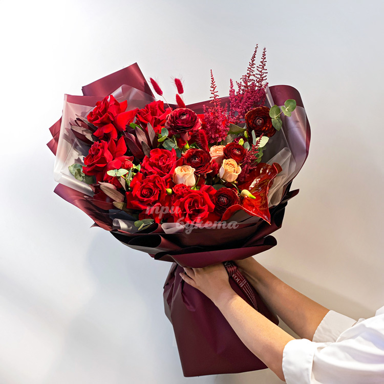Букет красных ранункулюсов, роз и зелени