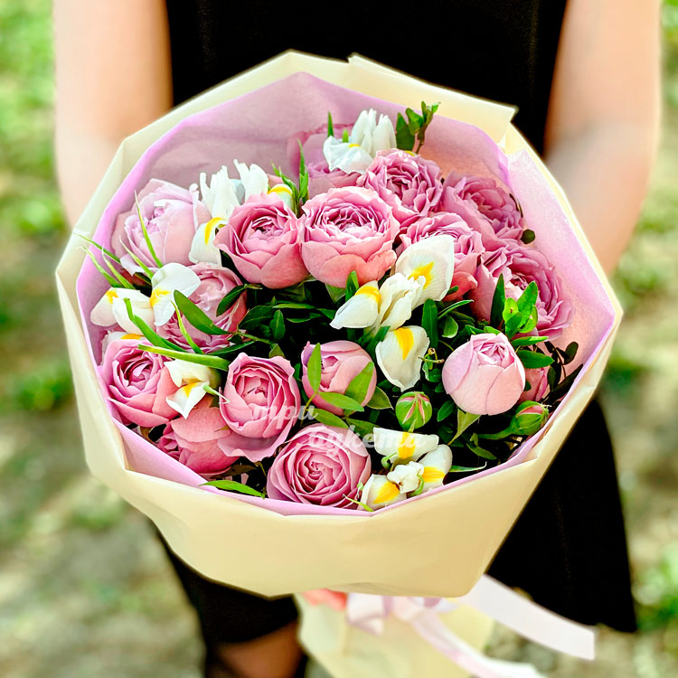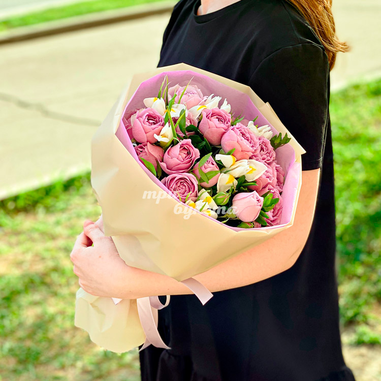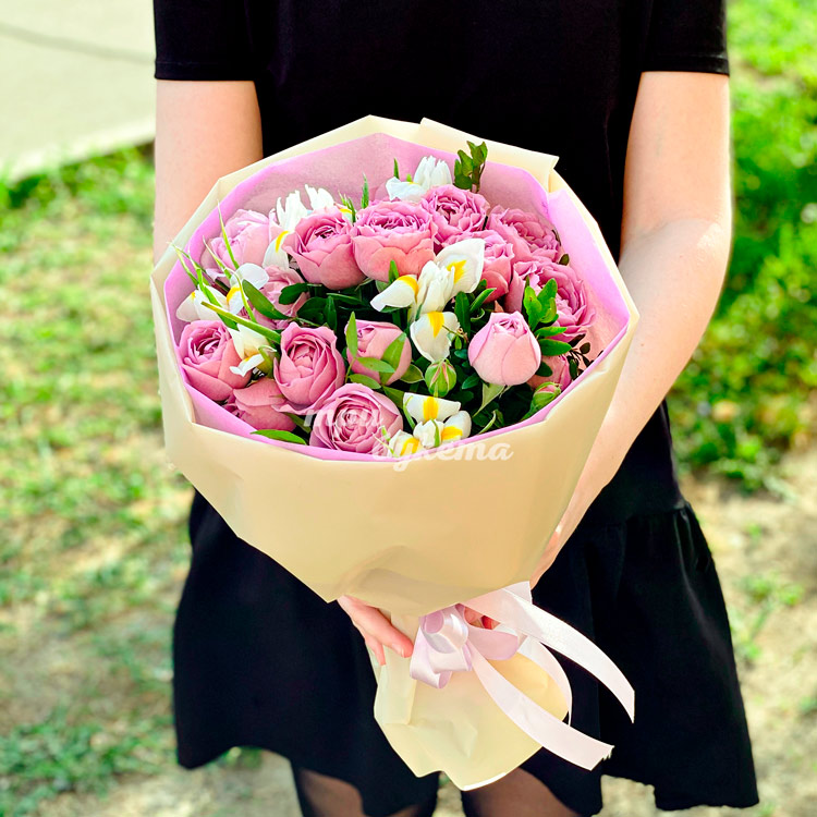 Букет пионовидных роз и белых ирисов