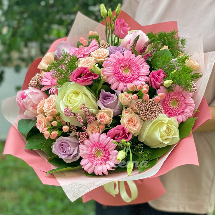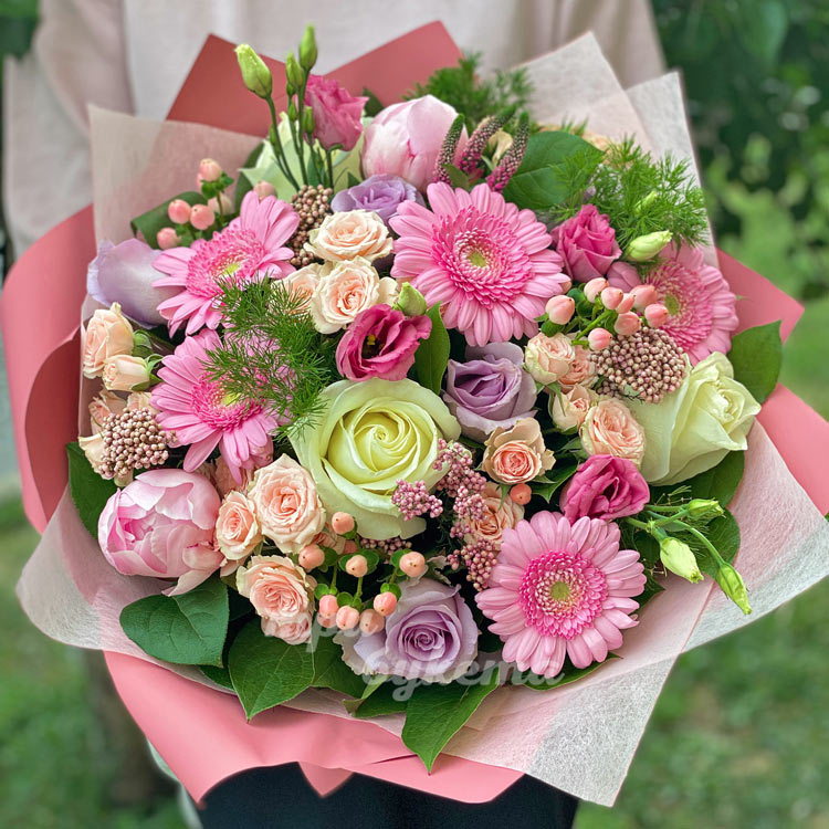 Букет розовых гербер, пионов и роз