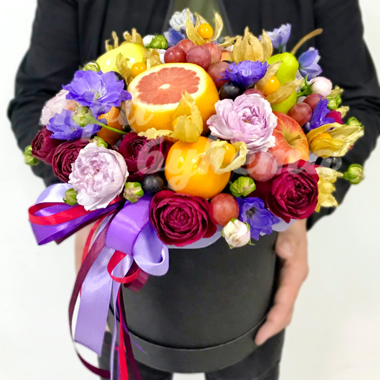 Фрукты и розы в шляпной коробке