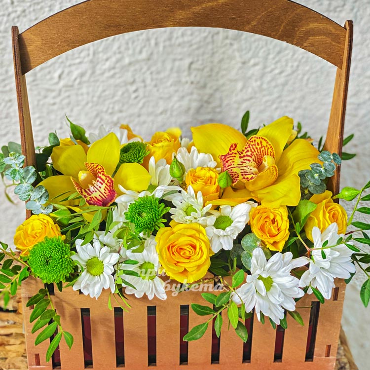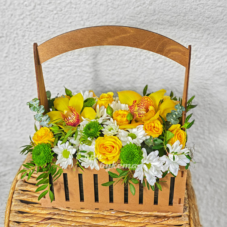 Хризантемы и желтые орхидеи в ящичке