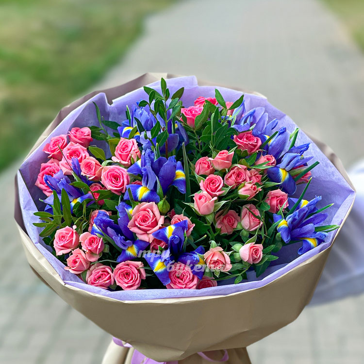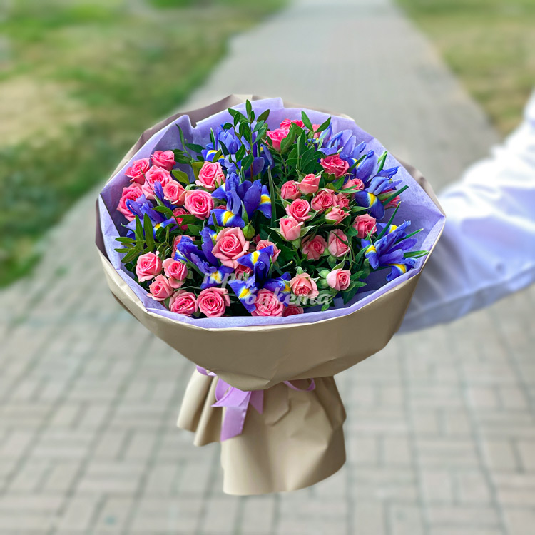 Ирисы и розовые кустовые розы в букете
