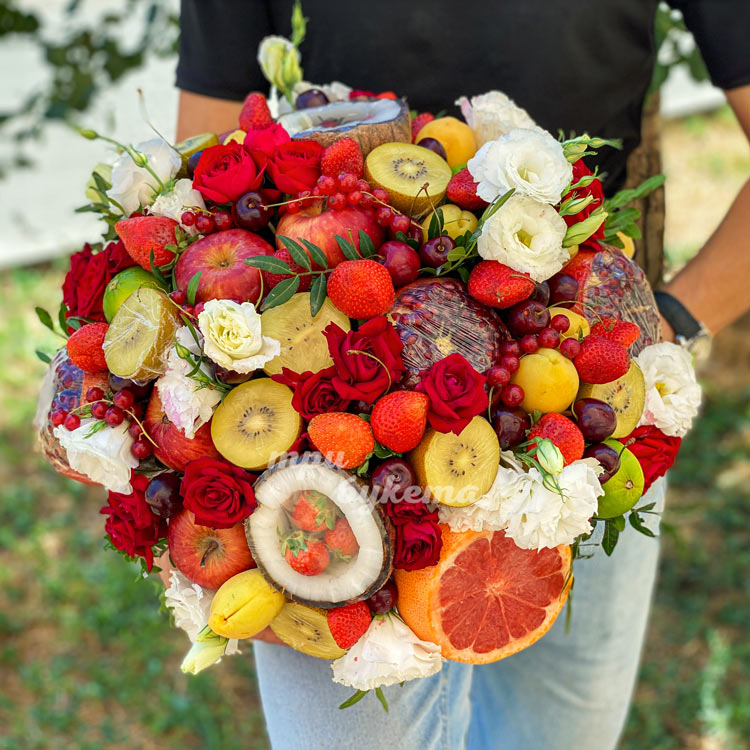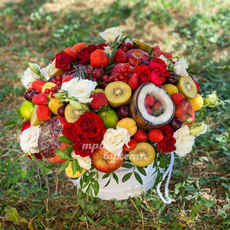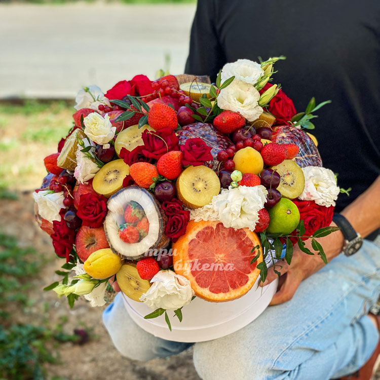 Коробка с фруктами, клубникой и цветами