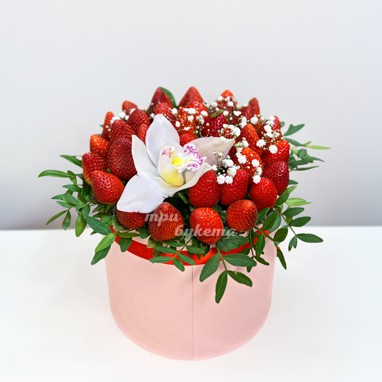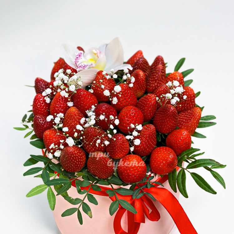 Коробка с клубникой и белой орхидеей