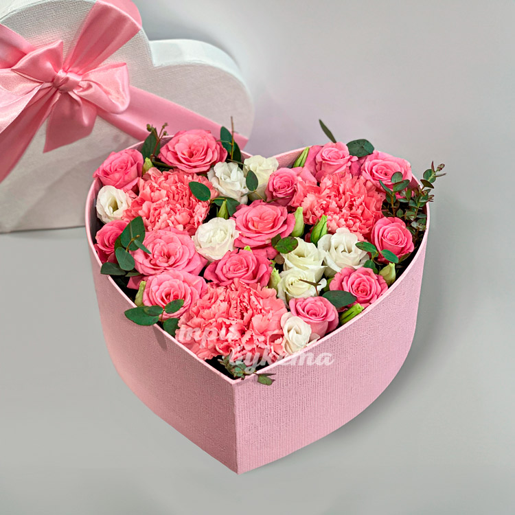 Коробка сердце с гвоздиками и розами