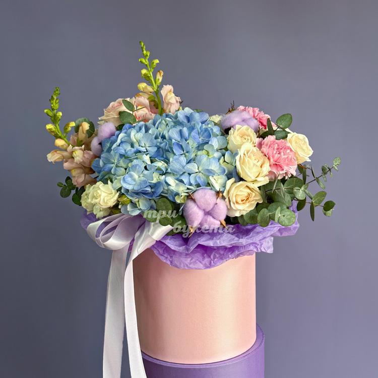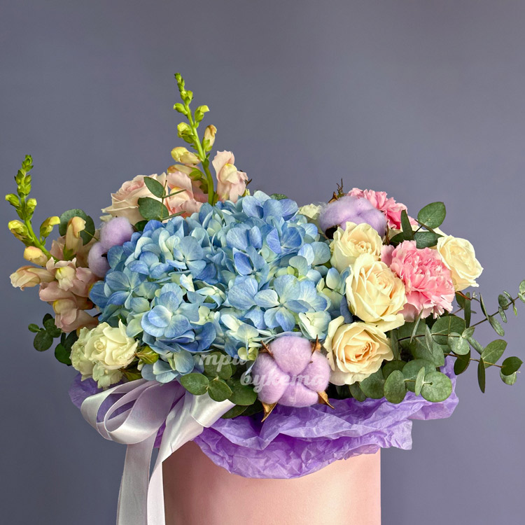 Коробка ярких роз и гортензии с хлопком