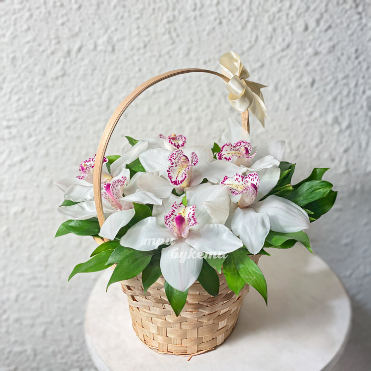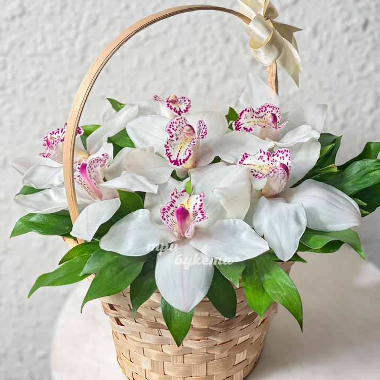 Корзина белых орхидей с рускусом