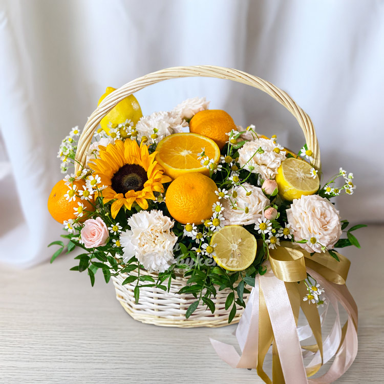 Корзина цитрусовых с розами и гвоздиками