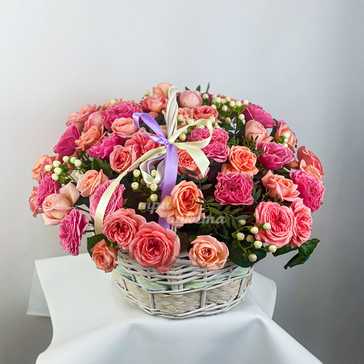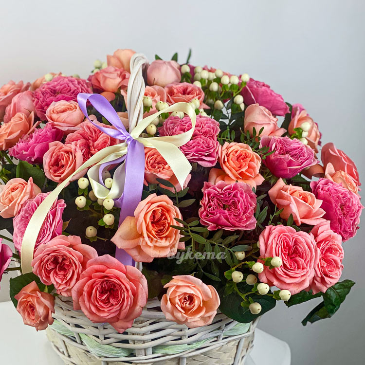 Корзина розовых кустовых роз с гиперикумом