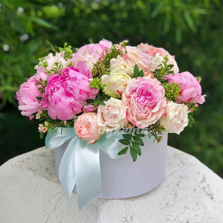 Нежные пионы в шляпной коробке