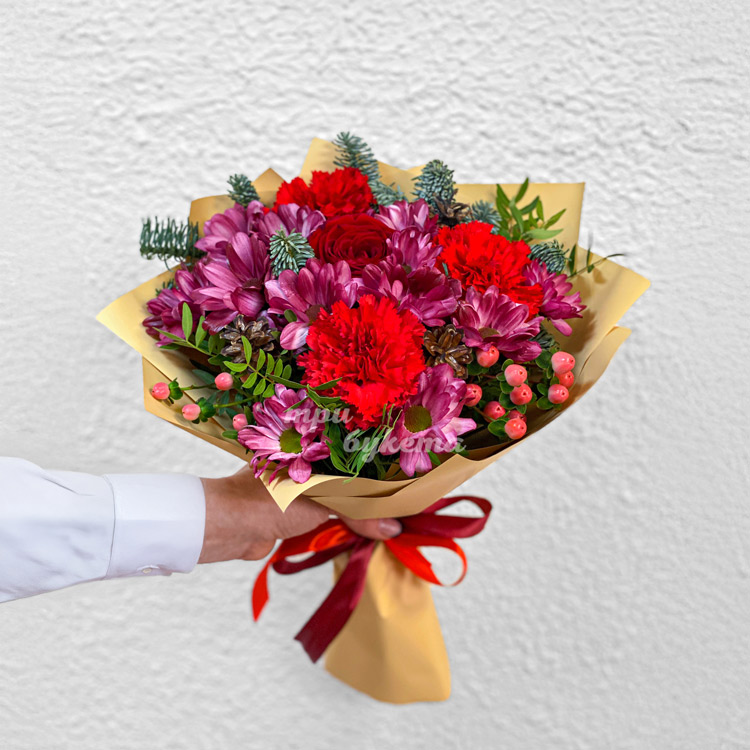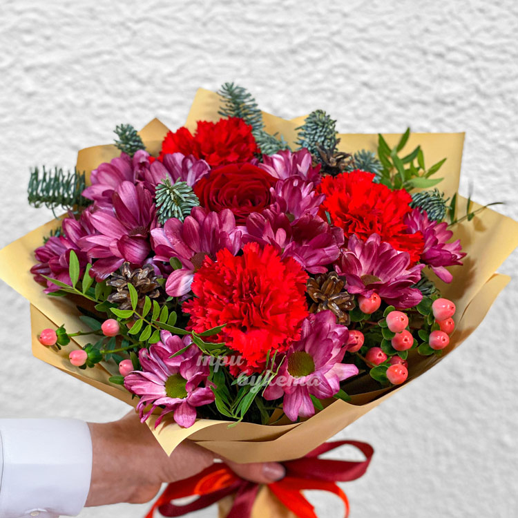 Новогодний букет из хризантем и гвоздик