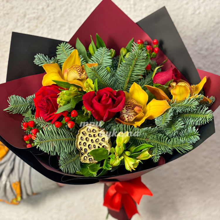 Новогодний букет орхидей, роз и хвои