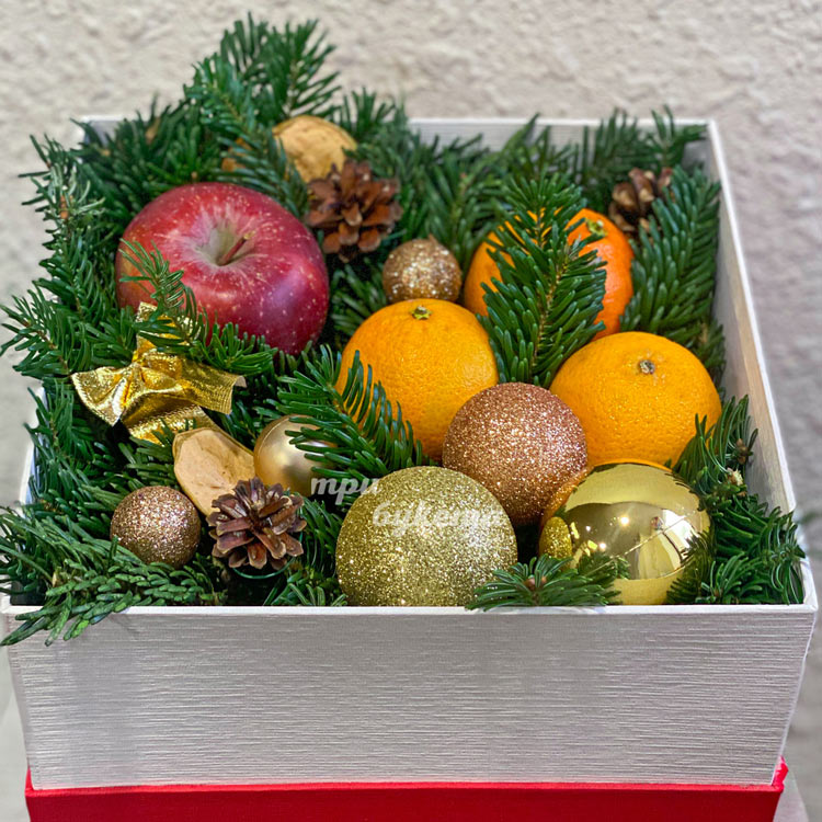 Новогодняя коробка с яблоком и апельсинами