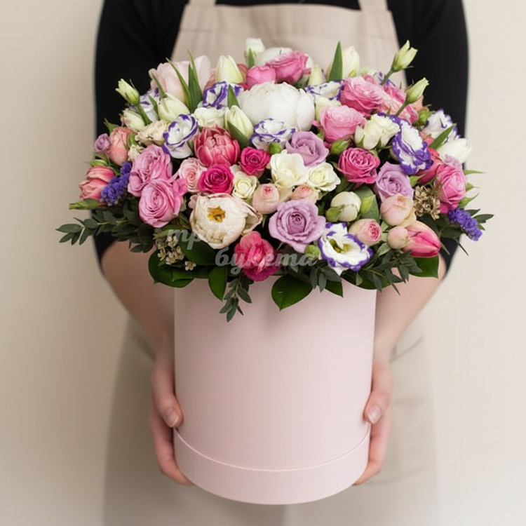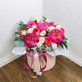 Пионы и розы с тюльпанами в коробке