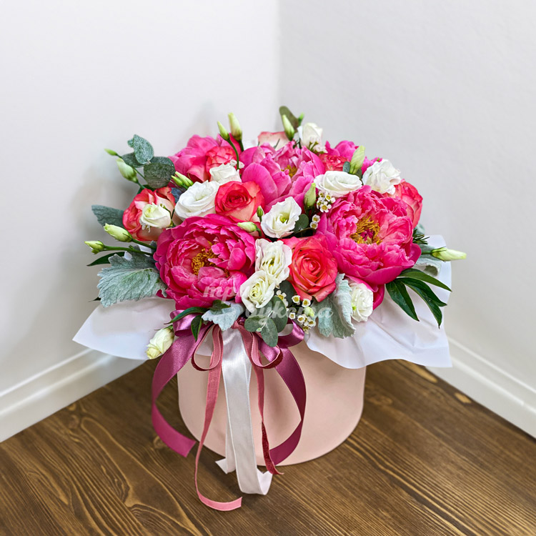 Пионы и розы в шляпной коробке