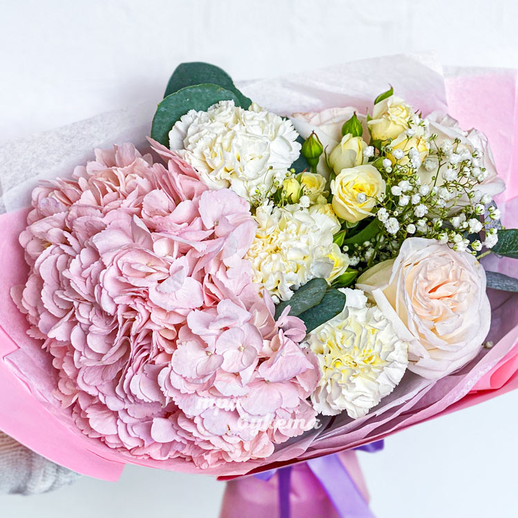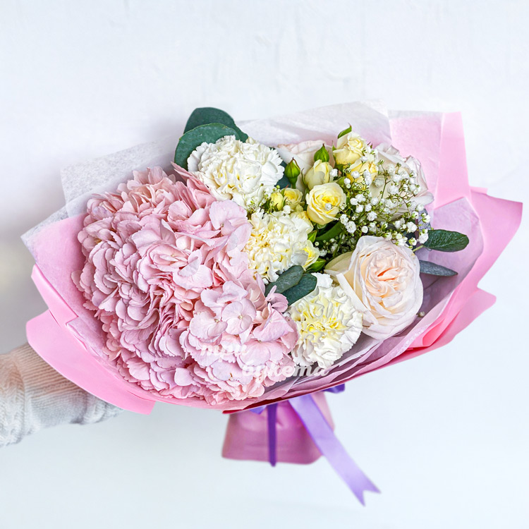 Розовый букет из гортензии, гвоздик и роз