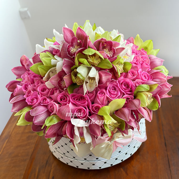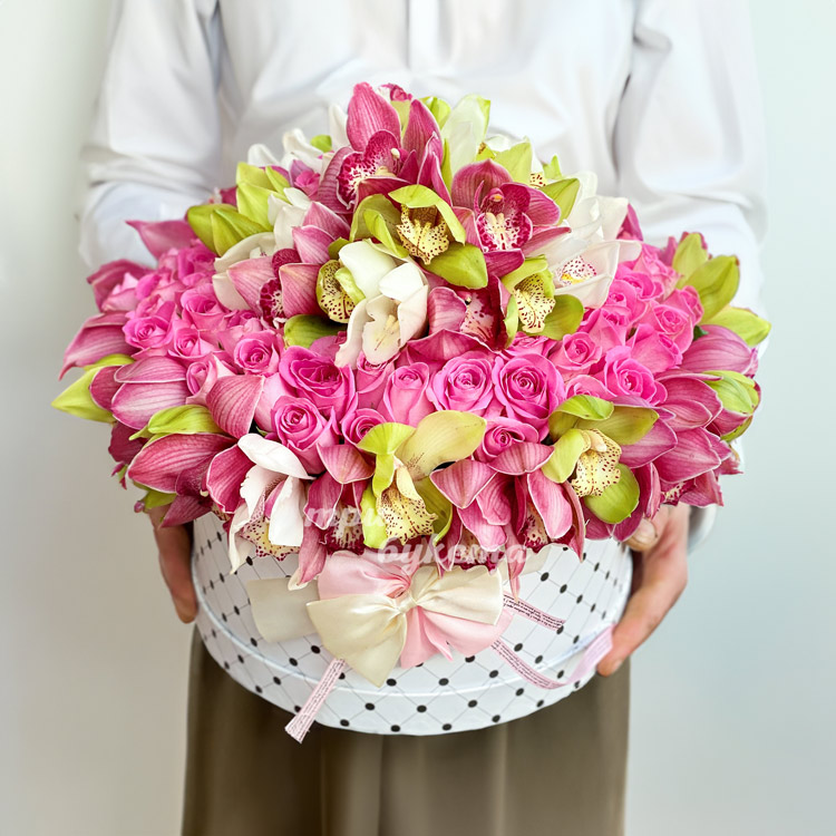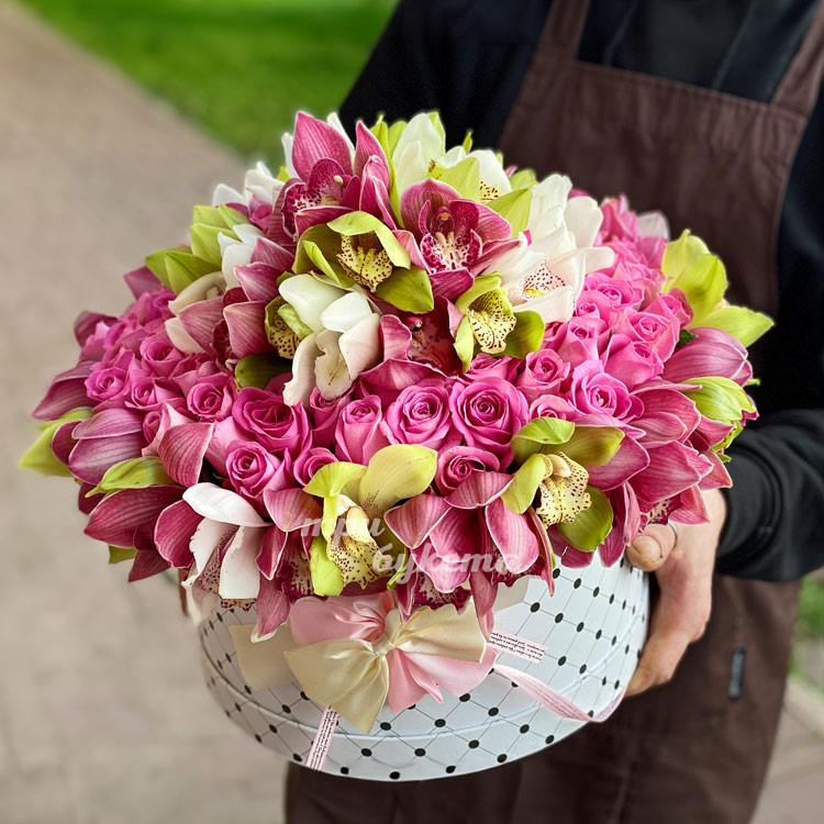 Шляпная коробка с орхидеями и розами