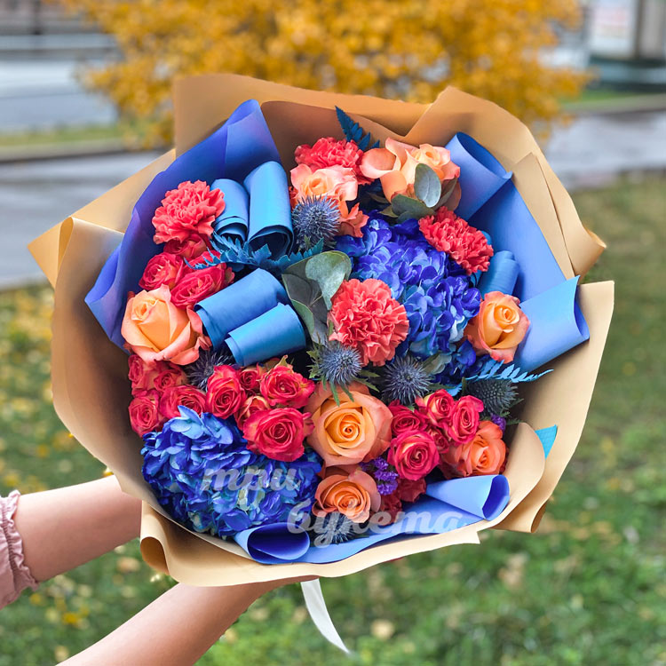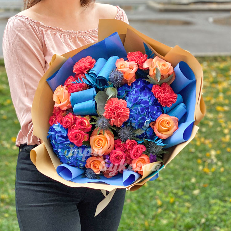 Синие гортензии и розовые гвоздики
