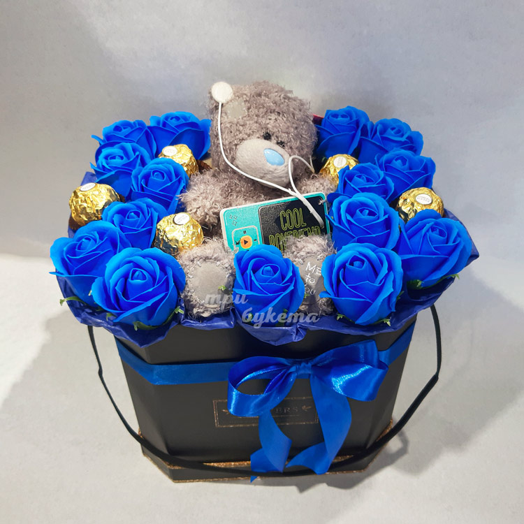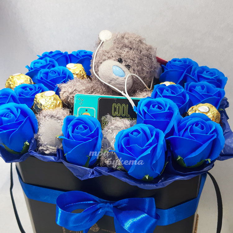Синие мыльные розы с мишкой в коробке