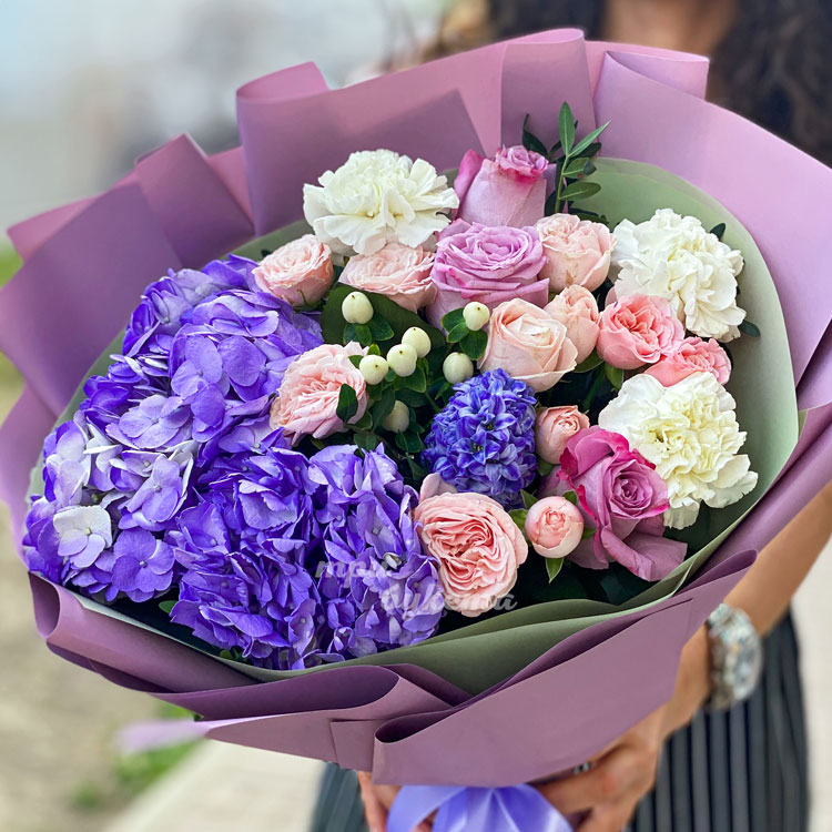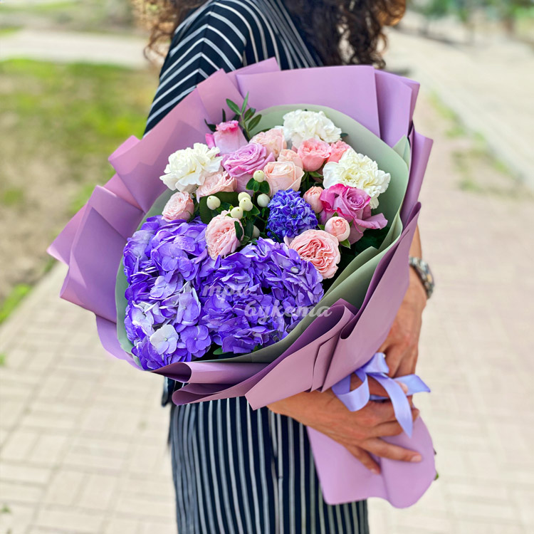 Сиреневый букет гортензий и кустовых роз