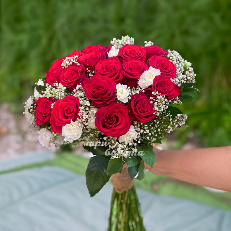 Высокие красные розы с белыми гвоздиками