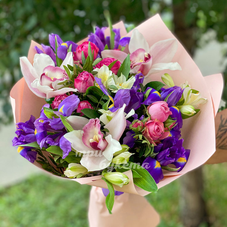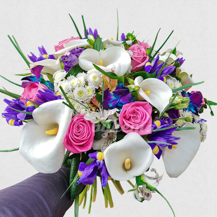 Яркий букет из ирисов, калл и роз