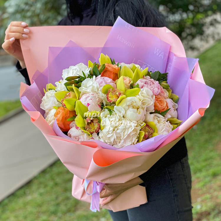 Яркий букет орхидей, гортензий и пионов